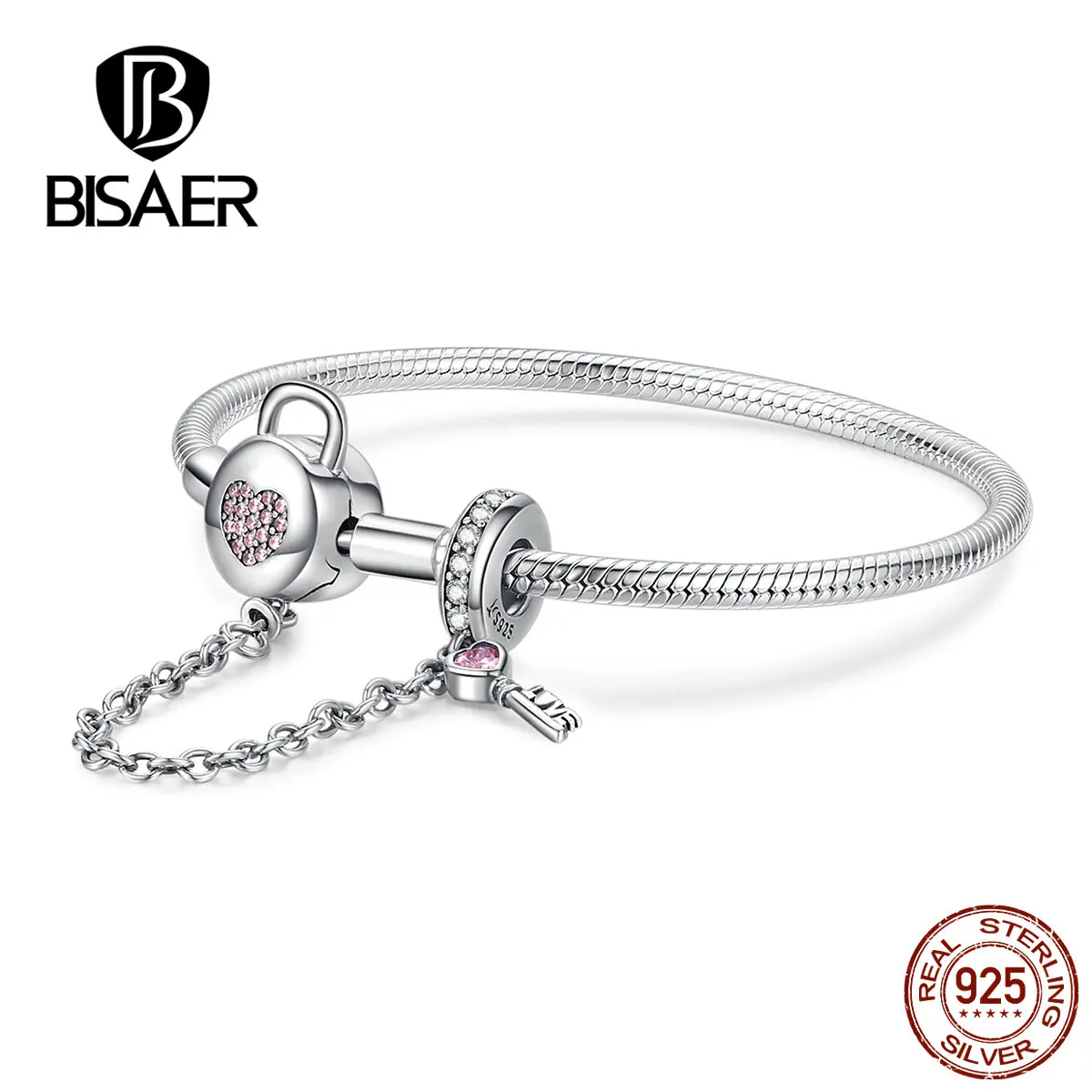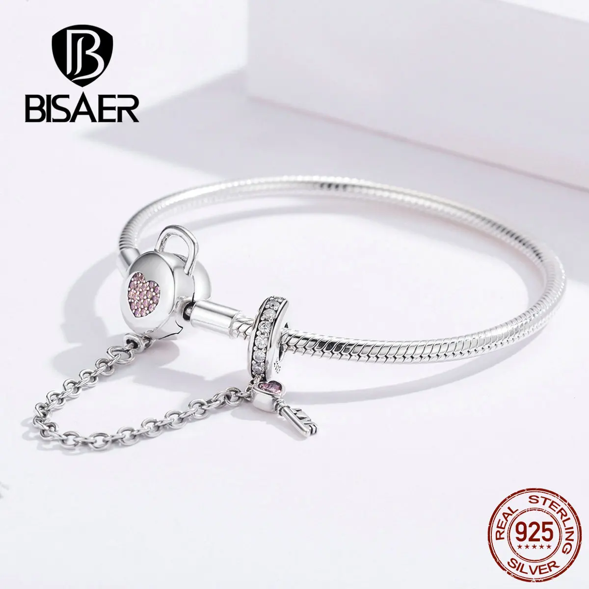BISAER 925 Sterling Silver Heart Shape Lock Clasp Safety Chain Femme Silver Bracelets for Women Lux