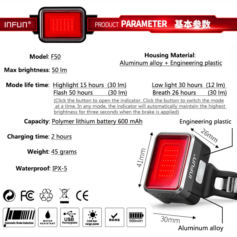 - Product name : INFUN F50 Bicycle Rear Light For Bike Automatic Brake Induction Taillight MTB Cycling Charge LED Sa